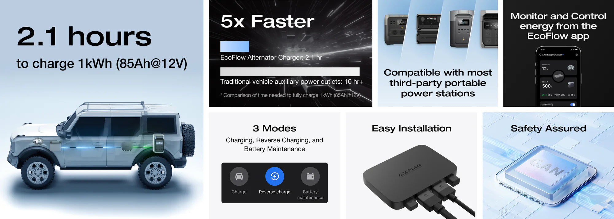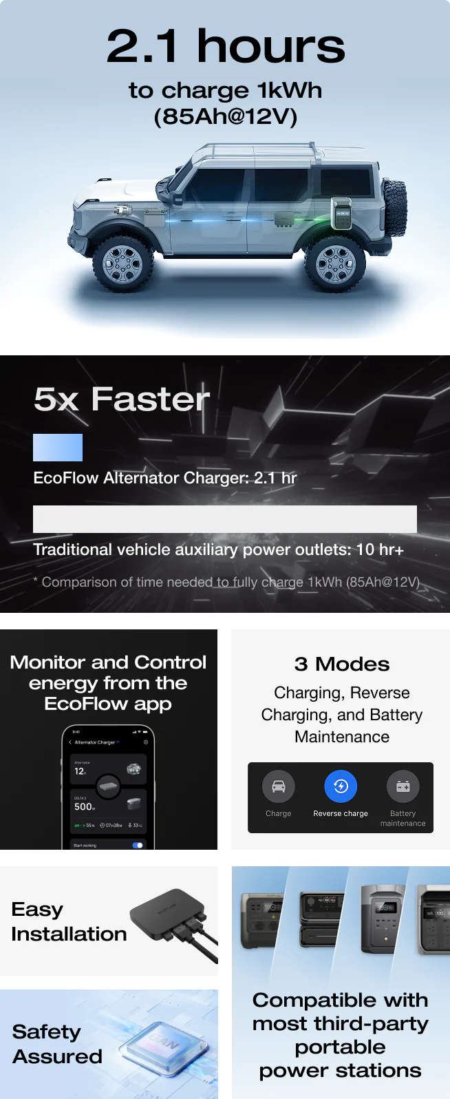 Stay powered on the go with the EcoFlow 500W Alternator Charger. Using excess energy from your vehicle, it restores your EcoFlow power station up to 5× faster than standard 12V auxiliary sockets — topping up 1kWh (85Ah@12V) in only 2.1 hours. Its built-in DC-DC converter ensures efficient charging while you drive.
