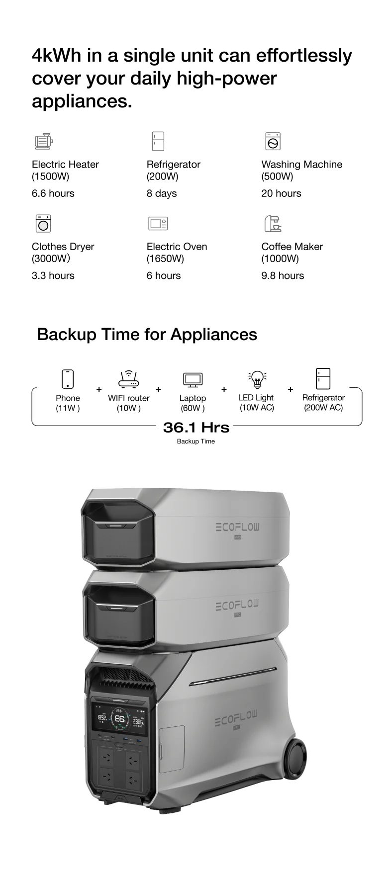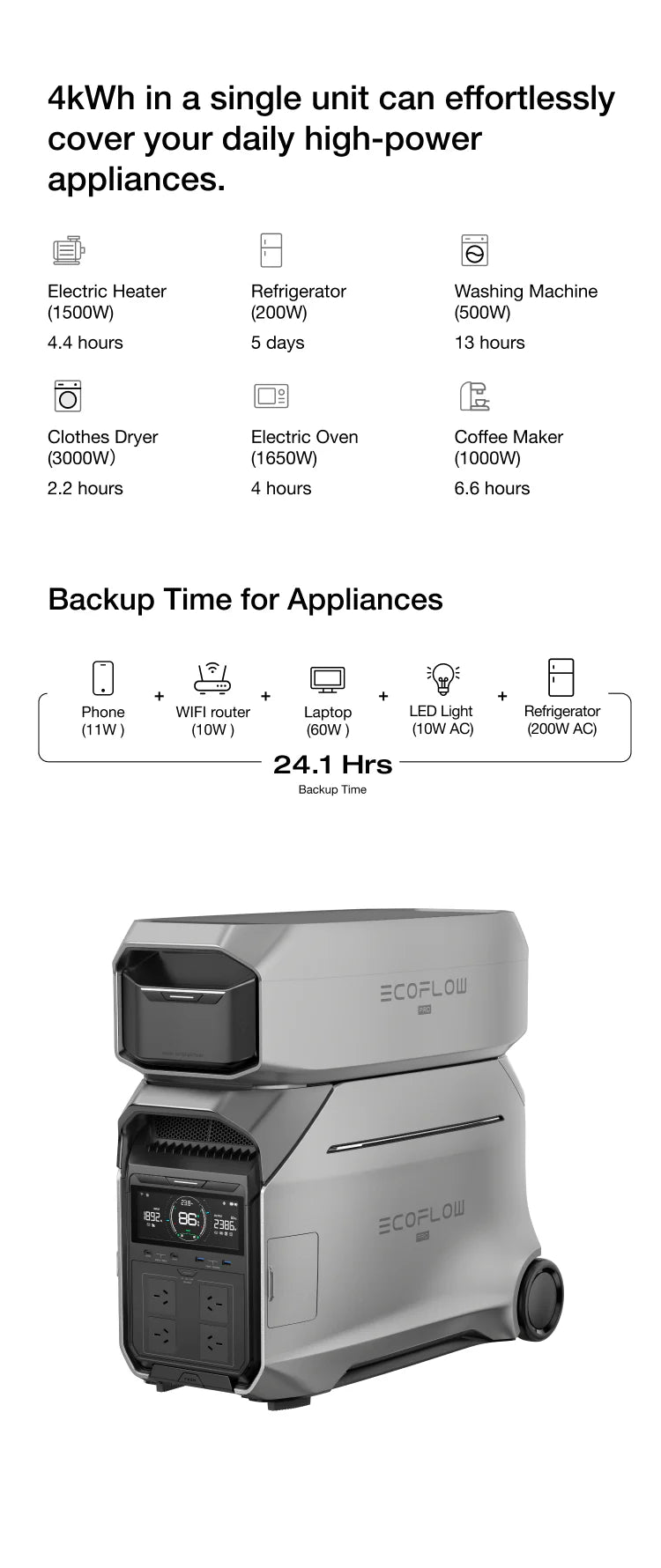 Power almost all your essential home appliances with the robust 4000W and 230V capabilities of a